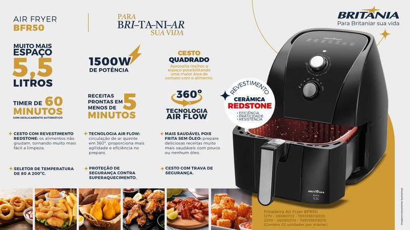 Modelo detalhado | Air Fryer Britânia Fritadeira sem Óleo 5,5L Antiaderente Timer 60min Até 200°C 1500W BFR50 |