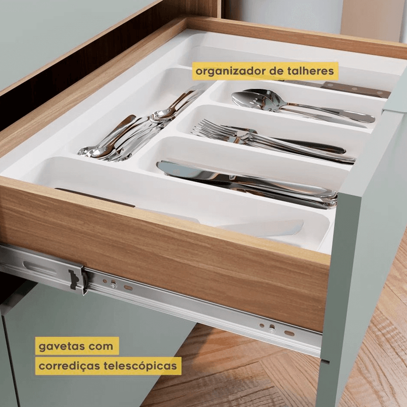 As portas contam com dobradiças slow motion com freio anti-impacto, que proporcionam fechamento suave e silencioso, enquanto os puxadores de alumínio, na cor da porta, completam o design sofisticado. As três gavetas contam com corrediças telescópicas de três estágios e abertura total — uma delas com organizador de talheres e outra com porta temperos, trazendo praticidade e organização ao ambiente.