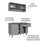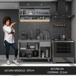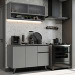 O acabamento da cozinha é cinza, feito em Pintura Poliéster ecológica, que oferece proteção contra os efeitos da água e do calor.
