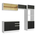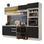 O acabamento da estrutura é Branco Fosco e as portas e frentes são em preto. É feito em Pintura Poliéster ecológica de alta resistência, que confere maior durabilidade e durabilidade ao móvel e oferece proteção contra os efeitos da água e do calor.