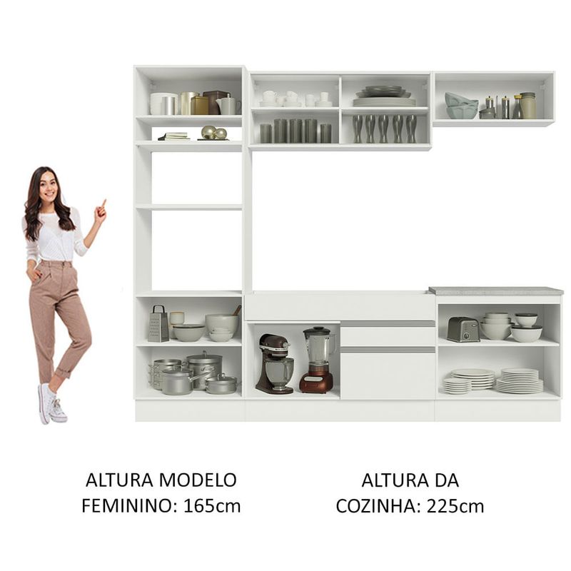 O acabamento da cozinha é branco, feito em Pintura Poliéster com 7 camadas que protegem o móvel dos efeitos do álcool da água e do calor.