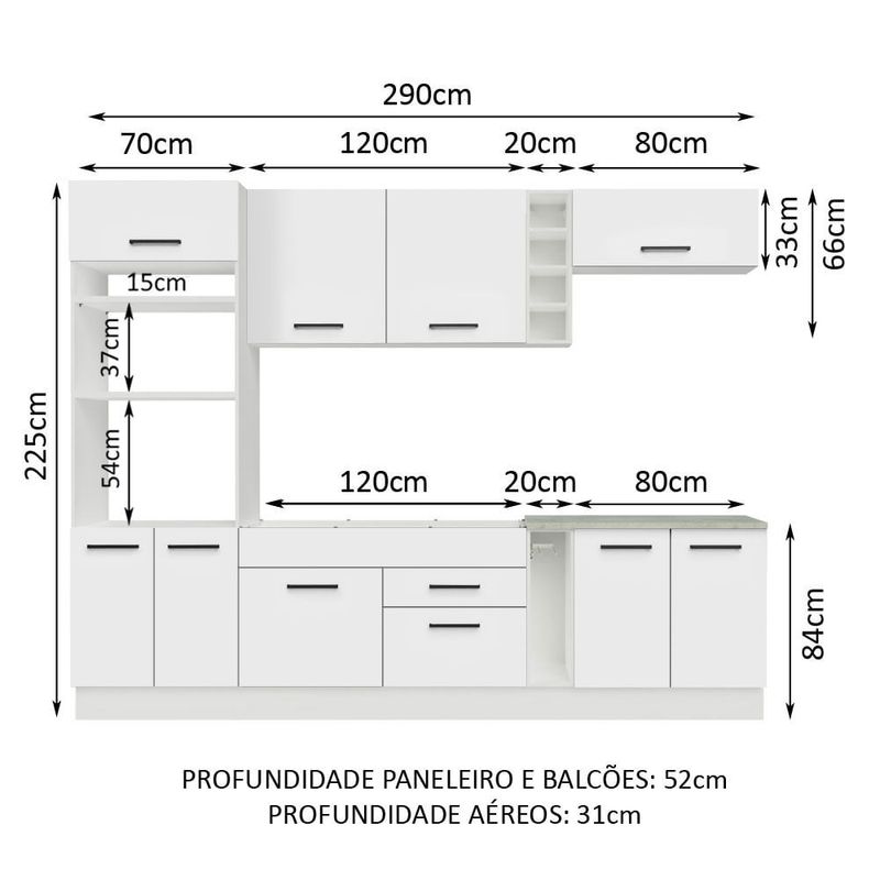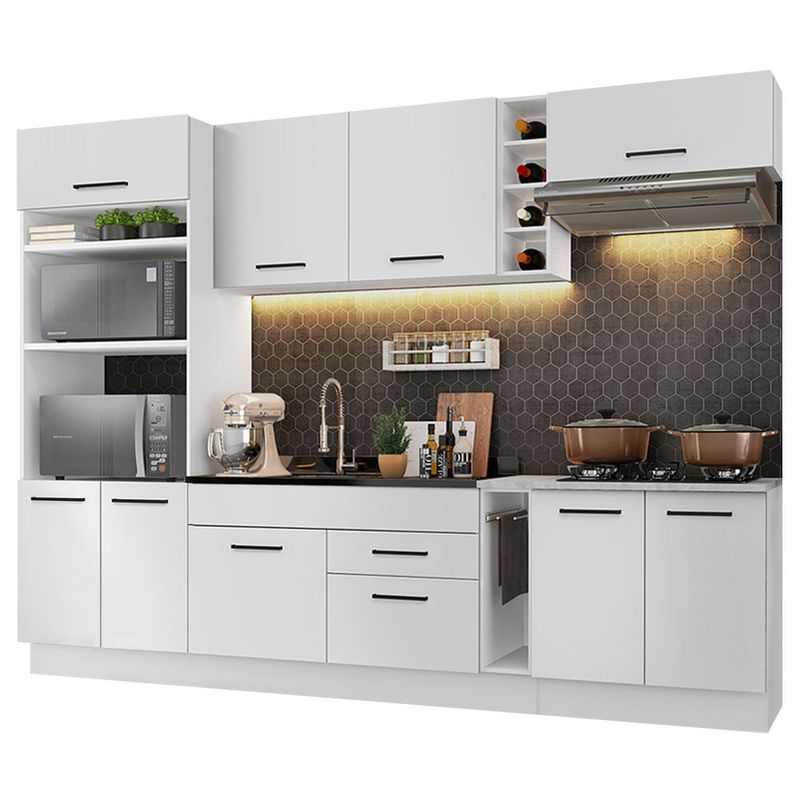 Esta versão é super completa e conta com torre quente com espaço para forno e micro-ondas, além de adega e balcão porta-pano. O balcão de pia no tamanho de 120 x 52 cm suporta pias de inox e pedra e o balcão de 80 cm acompanha tampo, que pode ser recortado para colocação de cooktop.