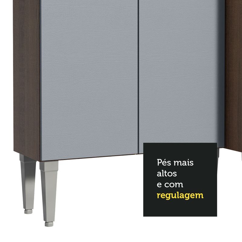Possui materiais de qualidade superior, como puxadores com alumínio, corrediças e dobradiças metálicas e pés em PVC com regulagem para pequenas imperfeições no piso. Além disso, ambos os balcões acompanham tampo e você também pode fazer a instalação de uma pia de inox ou pedra, no tamanho de 105 x 44 cm.