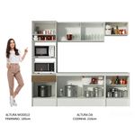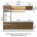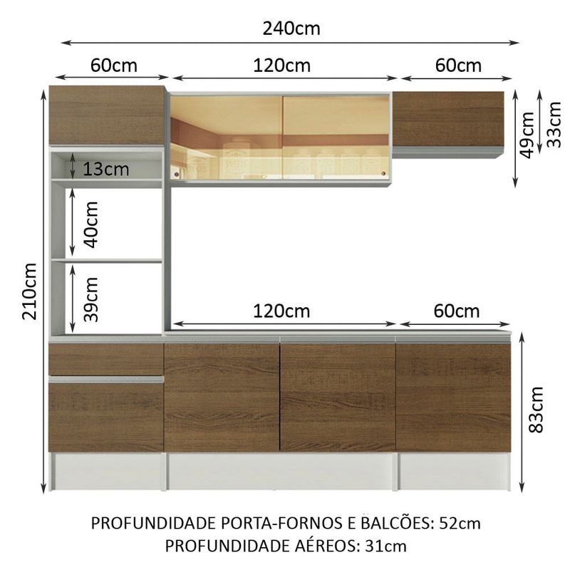 As medidas totais são: 240 cm de largura e 210 cm de altura; profundidades de 31 cm nos aéreos e 52 cm nos balcões e paneleiro.