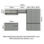 - 52 cm de profundidade no balcão e nos paneleiros e 31 cm nos aéreos