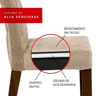 As cadeiras são grandes e robustas com estrutura em MDF. O encosto e o assento possuem estofamento total com uma combinação de espumas de alta densidade aumentando a durabilidade e o conforto. Para completar, contam com revestimento em tecido Suede Imperial e uma costura especial estilo matelassê, formando gomos na parte frontal e traseira do encosto, proporcionando maciez e beleza.