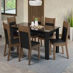 A mesa é retangular, com pés estruturais e acomoda perfeitamente até seis pessoas. O vidro incolor sobreposto ao tampo de madeira deixa o ambiente ainda mais elegante.