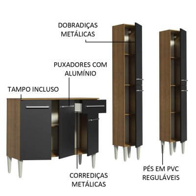 É fabricada com materiais de qualidade, como puxadores com detalhe em alumínio e corrediças e dobradiças metálicas. Os pés são em PVC, para facilitar a limpeza e reguláveis para nivelar pequenas imperfeições no piso. Para completar, o balcão comporta pias de 105 cm x 44 cm e acompanha tampo de MDP.