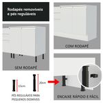 Outro diferencial desta cozinha são os pés reguláveis em PVC e os rodapés removíveis em MDP, que facilitam a limpeza. O balcão comporta pias de inox ou pedra, no espaço de 150 x 52 cm.