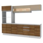 Possui puxadores em alumínio, corrediças e dobradiças metálicas e rodapés encaixados com pés em PVC com regulagem de altura. Seu aéreo em vidro agrega beleza e sofisticação. Um diferencial é que contempla o tampo do balcão de pia e o balcão de 60 cm segue com tampo que pode ser recortado para a colocação do cooktop.
