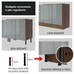A profundidade é de cozinha planejada: 60 cm. Além disso, os pés dos balcões são reguláveis em PVC, com rodapé removível para facilitar na hora de fazer a limpeza.