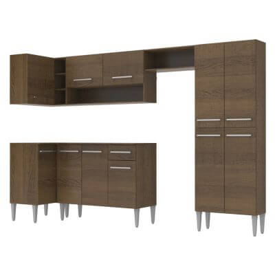 Ela é dividida em cinco módulos independentes: balcão de canto reto, armário aéreo de canto reto com duas portas e adega, balcão de pia, armário aéreo com duas portas e dois nichos e um paneleiro duplo com quatro portas. O acabamento interno e externo é no padrão amadeirado Rustic, em Pintura Poliéster com 7 camadas de proteção que oferece resistência contra os efeitos da água e do calor.