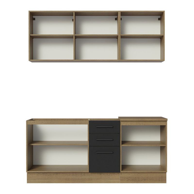 O acabamento da estrutura é no padrão amadeirado Rustic. As portas e frentes são pretas e as partes internas das costas e das gavetas são brancas. É feito em Pintura Poliéster ecológica, que consiste na aplicação de 7 camadas de proteção resistentes a álcool, água e calor.