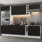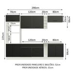 O acabamento da estrutura é branco e as portas e frentes são pretas. É feito em Pintura Poliéster, com 7 camadas de proteção resistentes a álcool, água e calor.