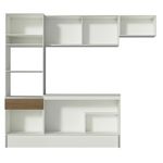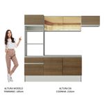 As medidas totais são: 240 cm de largura e 210 cm de altura; profundidades de 31 cm nos aéreos e 52 cm no balcão e na torre.