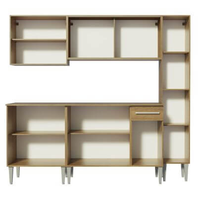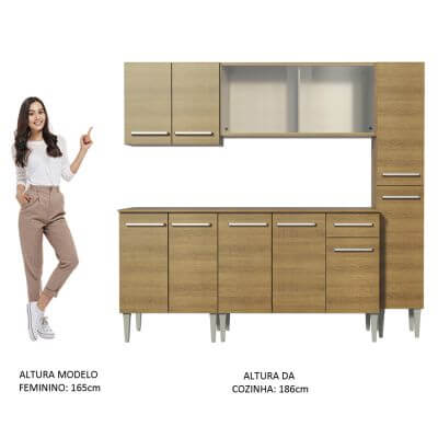 Medidas totais: 186 cm de altura x 201 cm de largura x 44 cm profundidade nos balcões e 27 cm nos aéreos e no paneleiro.