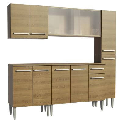A Cozinha Emilly Fast da Madesa é fabricada com materiais de qualidade, como puxadores com detalhe em alumínio e corrediças e dobradiças metálicas. Um dos grandes destaques desta versão é o armário aéreo maior, que possui duas portas de correr de vidro no estilo, um detalhe que traz muita sofisticação e elegância à sua cozinha.