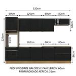 As medidas totais da cozinha são: 320 cm de largura e 225 cm de altura. O balcão de pia comporta pias de 120 cm x 60 cm e não acompanha tampo. Já o tampo do balcão de 80 cm pode ser recortado para instalação de cooktop.