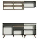 Para completar, ambos os balcões acompanham tampos, que podem ser removidos para colocação de pia e cooktop. Além disso, os pés em madeira são um charme a parte que além de beleza, conferem firmeza e resistência ao móvel.