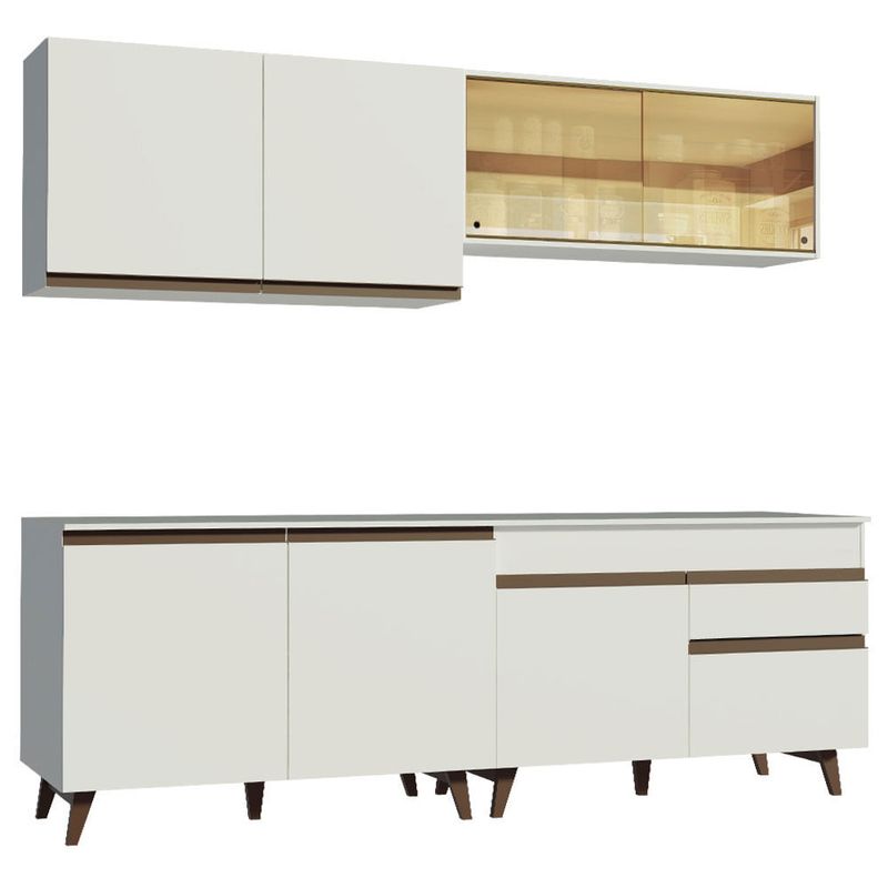 A fabricação da cozinha é feita com materiais de alto padrão, como corrediças e dobradiças metálicas. Os puxadores são embutidos, em alumínio na coloração marrom. Os módulos avulsos permitem a montagem conforme a disposição do ambiente e os pés em madeira são um charme a parte que além de beleza, conferem firmeza e resistência ao móvel.