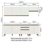 As medidas totais são: 250 cm de largura e 210 cm de altura. A profundidade é de cozinha planejada: 52 cm nos balcões e 31 cm nos aéreos.
