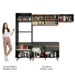 As medidas totais são: 260 cm de largura e 210 cm de altura. A profundidade é de cozinha planejada: 52 cm no balcão e na torre e 31 cm nos aéreos.