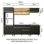 As medidas totais são: 260 cm de largura e 210 cm de altura. A profundidade é de cozinha planejada: 52 cm nos balcões e na torre e 31 cm nos aéreos.