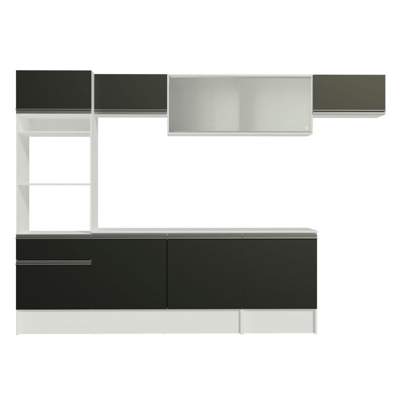 O acabamento da estrutura da cozinha é branco e as portas e a frente da gaveta são pretas. É feito em Poliéster Protetor ecológico, que consiste na aplicação de 7 camadas resistentes a álcool, água e calor.