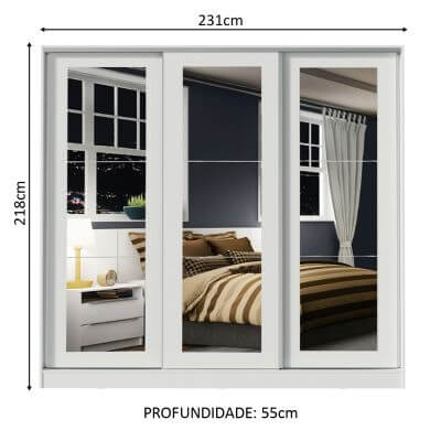 Medidas totais do armário: 218 cm de altura x 231 cm de largura x 55 cm de profundidade.