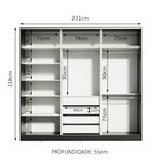 Medidas totais do armário: 218 cm de altura x 231 cm de largura x 55 cm de profundidade.