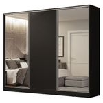 O fechamento é com três portas de correr, sendo duas com espelhos que ampliam o ambiente e dão um ganho de espaço enorme, sem comprometer a circulação no quarto.