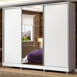 - Três (3) portas de correr com sistema anti-descarrilhamento, sendo duas (2) de madeira e uma (1) com espelhos
