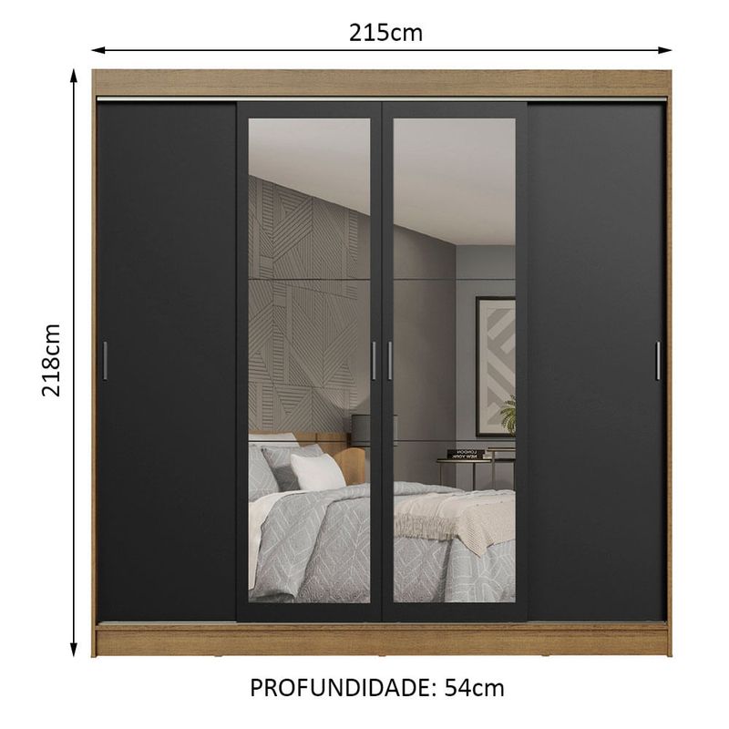 Medidas totais do guarda-roupa: 218 cm de altura x 215 cm de largura x 54 cm de profundidade.