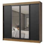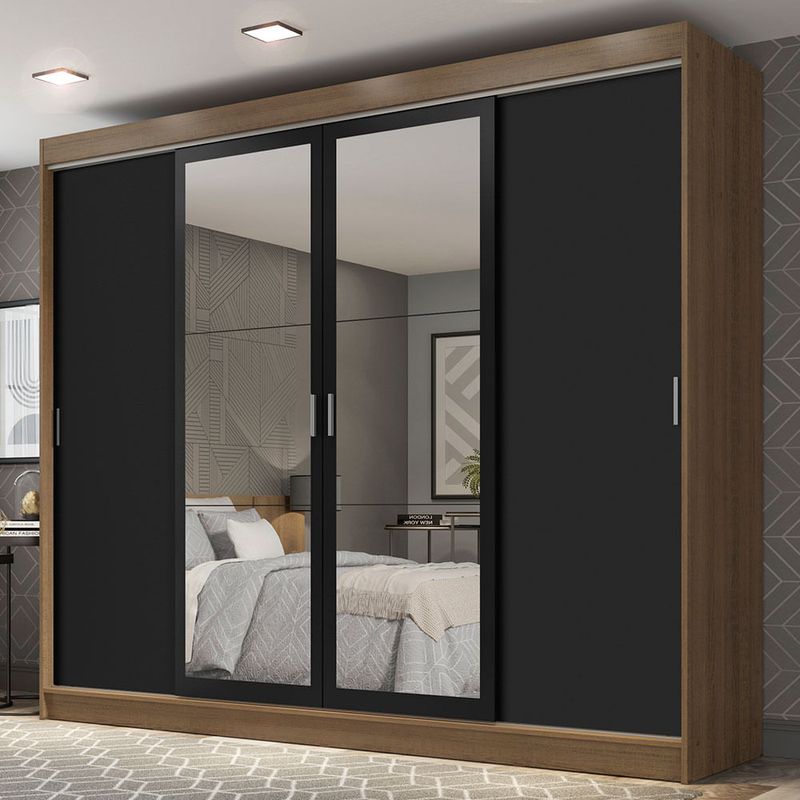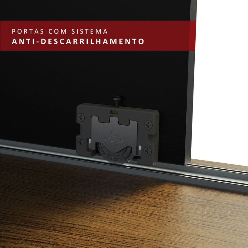 O móvel conta com quatro portas de correr com deslizamento suave, trilhos em alumínio para maior resistência e quatro puxadores externos. Além disso, o sistema anti-descarrilhamento evita com que as portas saiam do trilho e transmitem mais segurança no uso diário. Os espelhos, presentes em duas das portas, são bonitos, muito práticos e úteis.