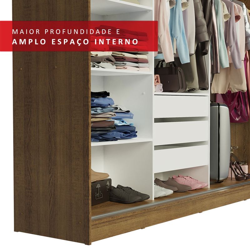 Internamente, são dois cabideiros de alumínio que oferecem espaço para roupas curtas e mais longas, além de diversas prateleiras, nichos e três gavetas espaçosas com corrediças metálicas. Dessa forma, cabe tudo que um casal precisa: calçados, malas, travesseiros, edredons e muito mais.