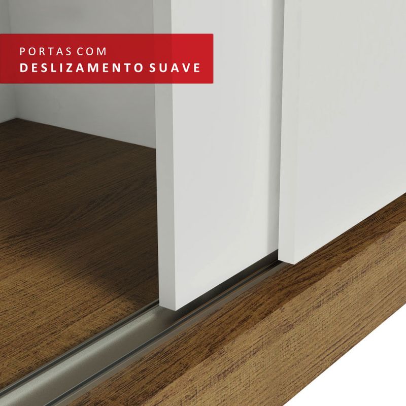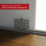 O móvel conta com quatro portas de correr com deslizamento suave, trilhos em alumínio para maior resistência e quatro puxadores externos. Além disso, o sistema anti-descarrilhamento evita com que as portas saiam do trilho e transmitem mais segurança no uso diário.