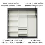 O tamanho é pensado especialmente para a necessidade de um casal. A divisão interna é ótima, com muitas prateleiras e nichos, além de três gavetas espaçosas com corrediças metálicas, muito mais seguras e resistentes.