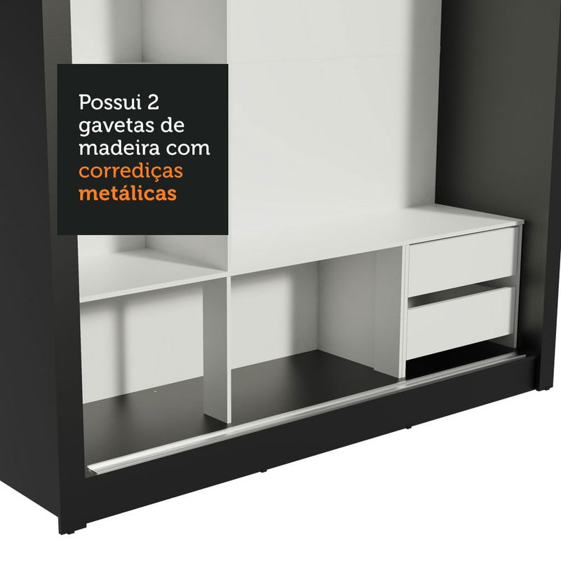 O aproveitamento interno é ideal para um casal. São duas gavetas com corrediça metálica, além de vários nichos que facilitam a organização de roupas, calçados e acessórios. O tubo cabideiro é metálico, muito resistente e possui espaço para roupas longas.