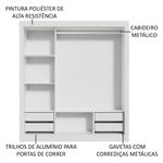 Total aproveitamento interno levando em conta o uso de duas pessoas. Nesta versão com quatro gavetas internas com corrediça metálica, diversos nichos que facilitam a organização de roupas, calçados e acessórios. O tubo cabideiro é muito resistente e possui espaço para roupas longas.
