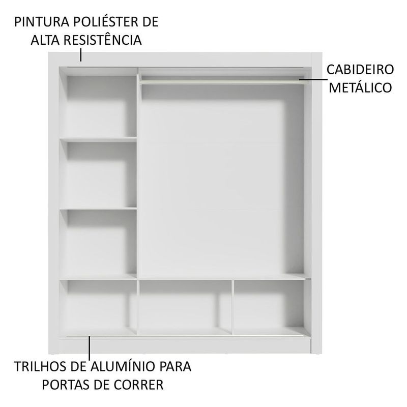 O aproveitamento interno é ideal para um casal. São diversos nichos que facilitam a organização de roupas, calçados e acessórios. O tubo cabideiro é metálico, muito resistente e possui espaço para roupas longas.