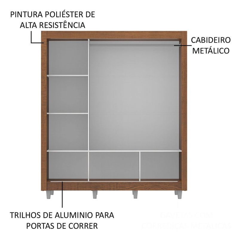 Total aproveitamento interno levando em conta o uso de duas pessoas. São muitos nichos que facilitam a organização de roupas, calçados e acessórios. O tubo cabideiro é muito resistente e possui espaço para roupas longas.