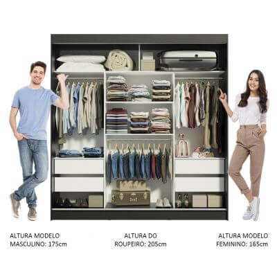 Medidas totais do guarda-roupa: 205 cm de altura x 180 cm de largura x 54 cm de profundidade.