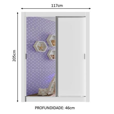 Medidas totais do guarda-roupa: 205 cm de altura x 117 cm de largura x 46 cm de profundidade.