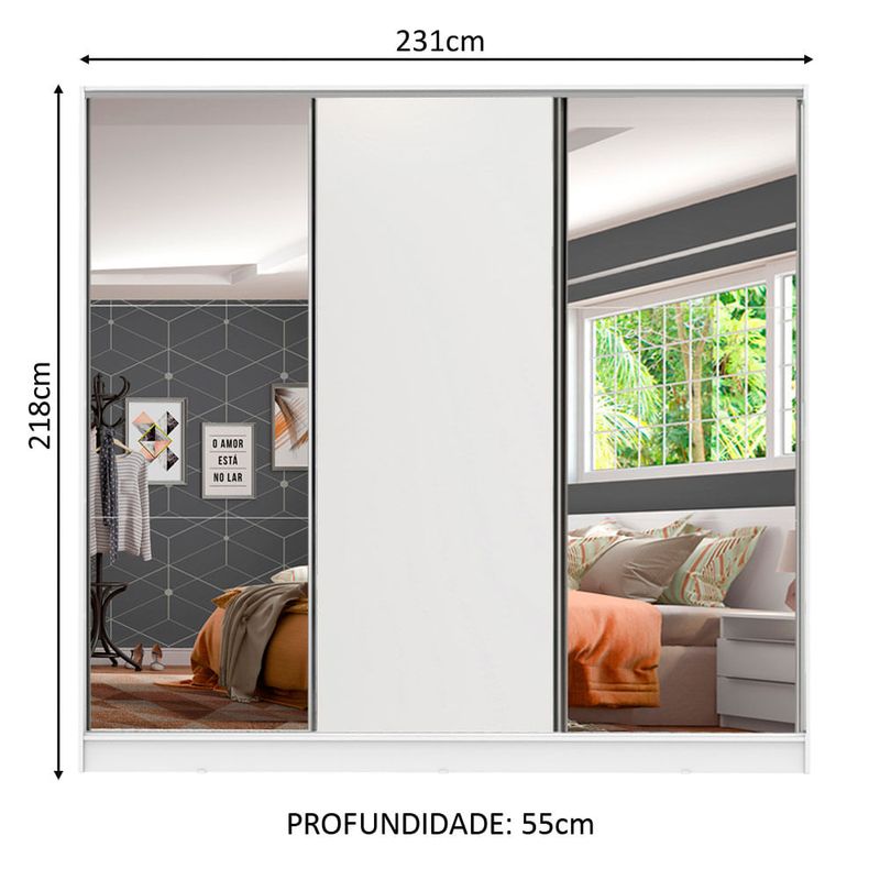 Medidas totais do armário: 218 cm de altura x 231 cm de largura x 55 cm de profundidade.