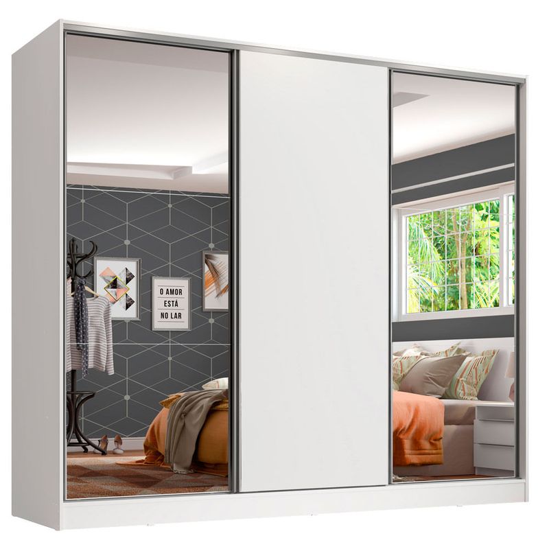 Os tubos cabideiros são em alumínio, muito resistentes e a profundidade do móvel é ideal para qualquer tamanho de cabide. Além disso, o fechamento com uma porta de correr de madeira e duas com espelhos amplia o ambiente e proporciona um ganho de espaço enorme, sem prejudicar a circulação no quarto.
