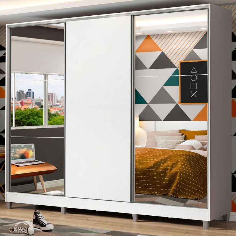 Os tubos cabideiros são em alumínio, muito resistentes e a profundidade do móvel é ideal para qualquer tamanho de cabide. Além disso, o fechamento com uma porta de correr de madeira e duas com espelhos amplia o ambiente e proporciona um ganho de espaço enorme, sem prejudicar a circulação no quarto.