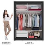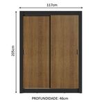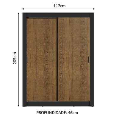 Medidas totais do guarda-roupa: 205 cm de altura x 117 cm de largura x 46 cm de profundidade.