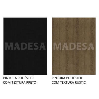 O acabamento da parte interna é branco. A estrutura externa é preta e as portas são no padrão amadeirado Rustic. O processo é feito coma Pintura Poliéster de 7 camadas exclusiva da Madesa. Este método é ecológico e aumenta a durabilidade ao móvel.