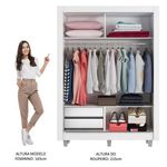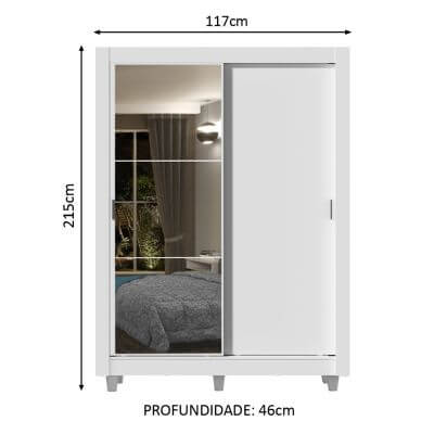 Medidas totais do guarda-roupa: 215 cm de altura x 117 cm de largura x 46 cm de profundidade.