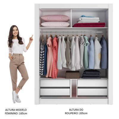 Medidas totais do guarda-roupa: 205 cm de altura x 117 cm de largura x 46 cm de profundidade.
